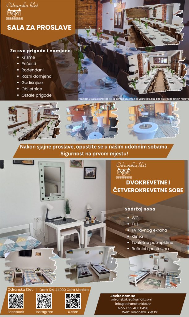 ODRANSKA KLET SALA ZA PROSLAVE Sala za sve prigode i namjene Krizme Pričesti Rođendani Razni domjenci Godišnjice Obljetnice Ostale prigode Ostale svečanosti Prostor uključuje sve potrebno za svečanosti Kompletan pribor za konzumaciju jela i pića Kuhinja (hladnjaci, sudoper, kuhala, elektro-plinska peć, suđerica) Sanitarni čvor Vanjska terasa s barskim stolovima Osiguran parking Ograđen vanjski prostor (mogučnost zaključavanja) Prilikom ulaska u prostor isti je odmah spreman za upotrebu, bez bilo kakvih dodatnih radova. Ukoliko Vam gosti dolaze iz udaljenijih krajeva, objekt u ponudi ima i sobe za smještaj i noćenje. Mogučnost otvaranja kafića – restorana. Nazovite već danas i osigurajte svoj termin za svečanost u Odranskoj Kleti… Nazovi Odranska Klet